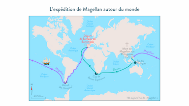 - En 1517, le noble Fernand de Magellan quitte le Portugal pour devenir espagnol : il apporte au jeune Charles Quint un grand projet, celui de faire pour la première fois un tour complet du globe afin d’en prendre les dimensions et d’établir une carte sûre.