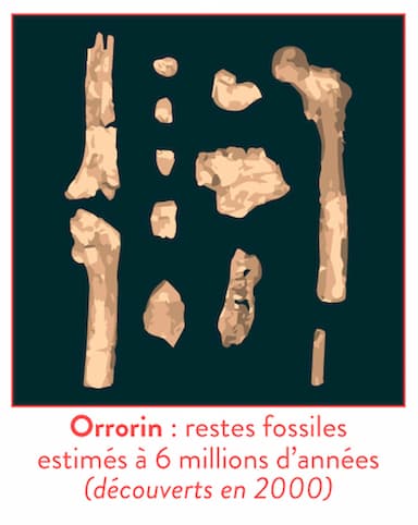 Nommé Orrorin Tugenensis, Orrorin, issu du nom d’un personnage mythique de la région, signifie « homme originel ». Son squelette partiellement recomposé, est très rapidement surnommé « Millenium Ancestor » soit « ancêtre du millénaire ». Il supplante dès lors Lucy en qualité de plus vieil hominidé trouvé de plus de 3 millions d’années, et renverse les théories que l’on avait sur les origines des premiers hommes ! Si l’humérus et la phalange soulignent le mode de vie encore arboricole (vie dans les arbres), en revanche, la forme du fémur trahit une position bipède. Il mesurerait aux alentour d’1,20 m et pèserait entre 30 et 50 kg.